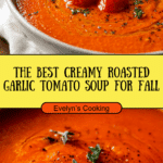 This creamy roasted garlic tomato soup is a comforting and flavorful dish made by roasting ripe tomatoes and garlic, then blending them with sautéed onions, tomato paste, vegetable stock, and a touch of cream. It’s rich, velvety, and perfect for a cozy meal.
