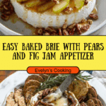 This Baked Brie with Pears and Fig Jam Recipe serves about 6 people, making it ideal for a small gathering or appetizer at a dinner party. The prep time is incredibly quick—just 5 minutes to gather and arrange your ingredients. Cooking takes 25 minutes in the oven, so you’re looking at a total of 30 minutes from start to finish. There’s no resting time needed since the brie is best enjoyed warm right out of the oven, but you’ll want to let it cool slightly to avoid burning yourself when serving.