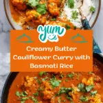 This Butter Cauliflower recipe is a flavorful Indian-inspired dish featuring tender cauliflower florets cooked in a rich, spiced tomato and cream sauce. With a blend of aromatic spices including garam masala, turmeric, and cumin, the cauliflower gets browned and charred for texture before simmering in a luscious buttery sauce. Served over fragrant basmati rice and garnished with fresh cilantro and Greek yogurt, it’s a comforting, hearty vegetarian meal perfect for any occasion.