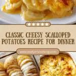 This classic Cheesy Scalloped Potatoes recipe features thinly sliced russet potatoes layered with onions and smothered in a creamy, sharp cheddar cheese sauce. Baked until tender and topped with a golden brown crust, this comforting side dish is perfect for family dinners and holiday meals.