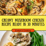Creamy Mushroom Chicken features golden-seared chicken breasts nestled in a rich, silky mushroom sauce made with garlic, lemon juice, chicken broth, Dijon mustard, and heavy cream. This comforting one-pan dish pairs perfectly with hearty sides like garlic roasted potatoes, rice pilaf, or crusty bread.