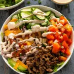 This fully loaded burger bowl with special sauce has all the flavors of a classic cheeseburger—without the bun! Juicy seasoned beef, crisp veggies, cheddar cheese, and a tangy, homemade sauce come together in a low-carb, crave-worthy bowl that’s perfect for meal prep or quick weeknight dinners.
