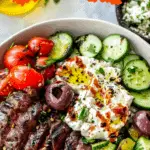I love how this recipe brings together so many textures and flavors—from the juicy, herb-marinated steak to the crunchy cucumbers, briny olives, and the cool, garlicky tzatziki. It’s a balanced meal that feels both indulgent and healthy. I can easily prep the components ahead of time, which makes this bowl perfect for a quick weeknight dinner or meal-prep lunch. The lemon vinaigrette ties everything together with a bright, zesty finish that keeps me coming back for more.