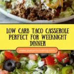 This Low Carb Taco Casserole is a delicious, keto-friendly dish combining seasoned ground beef, roasted cauliflower rice, and melted cheese. Perfect for a quick weeknight dinner, it’s topped with sour cream and fresh toppings like lettuce, tomato, and avocado for a flavorful, satisfying meal that’s low in carbs but high in taste.