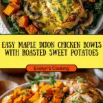 Delicious and wholesome Maple Dijon Chicken & Roasted Sweet Potato Bowls featuring tender marinated chicken breasts, smoky roasted sweet potatoes, and nutrient-packed quinoa or brown rice. This recipe combines sweet, tangy, and savory flavors with crunchy toasted nuts and fresh greens, perfect for a balanced, satisfying meal.