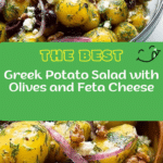 A vibrant and tangy Olive Greek Potato Salad combining tender petite potatoes with a zesty olive oil and red wine vinegar dressing, complemented by kalamata olives, sun-dried tomatoes, capers, fresh dill, red onion, and crumbled feta. Perfect for Mediterranean-inspired meals or as a flavorful side dish.