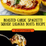 Seasonal roasted garlic spaghetti squash boats filled with a spicy Italian chicken sausage ragu and a creamy ricotta-provolone béchamel sauce, baked to golden perfection for a low-carb, comforting lasagna alternative.