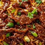 A savory and slightly sweet stir‑fried noodle dish with tender beef and sticky sauce